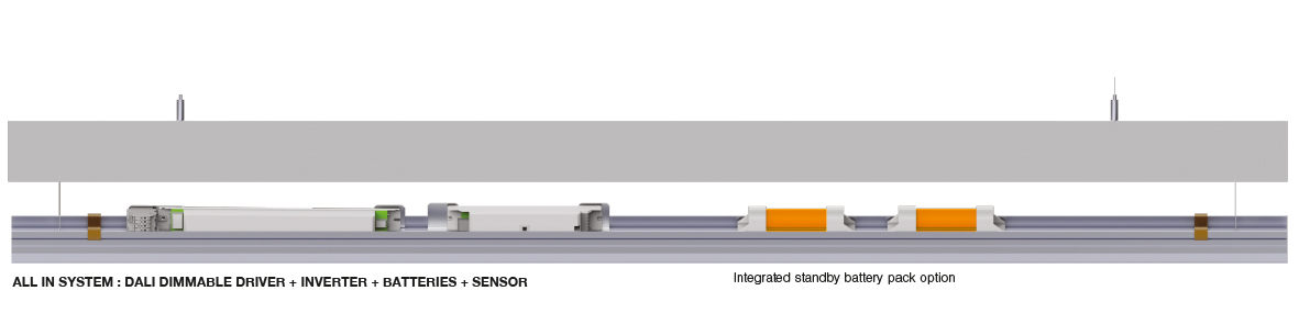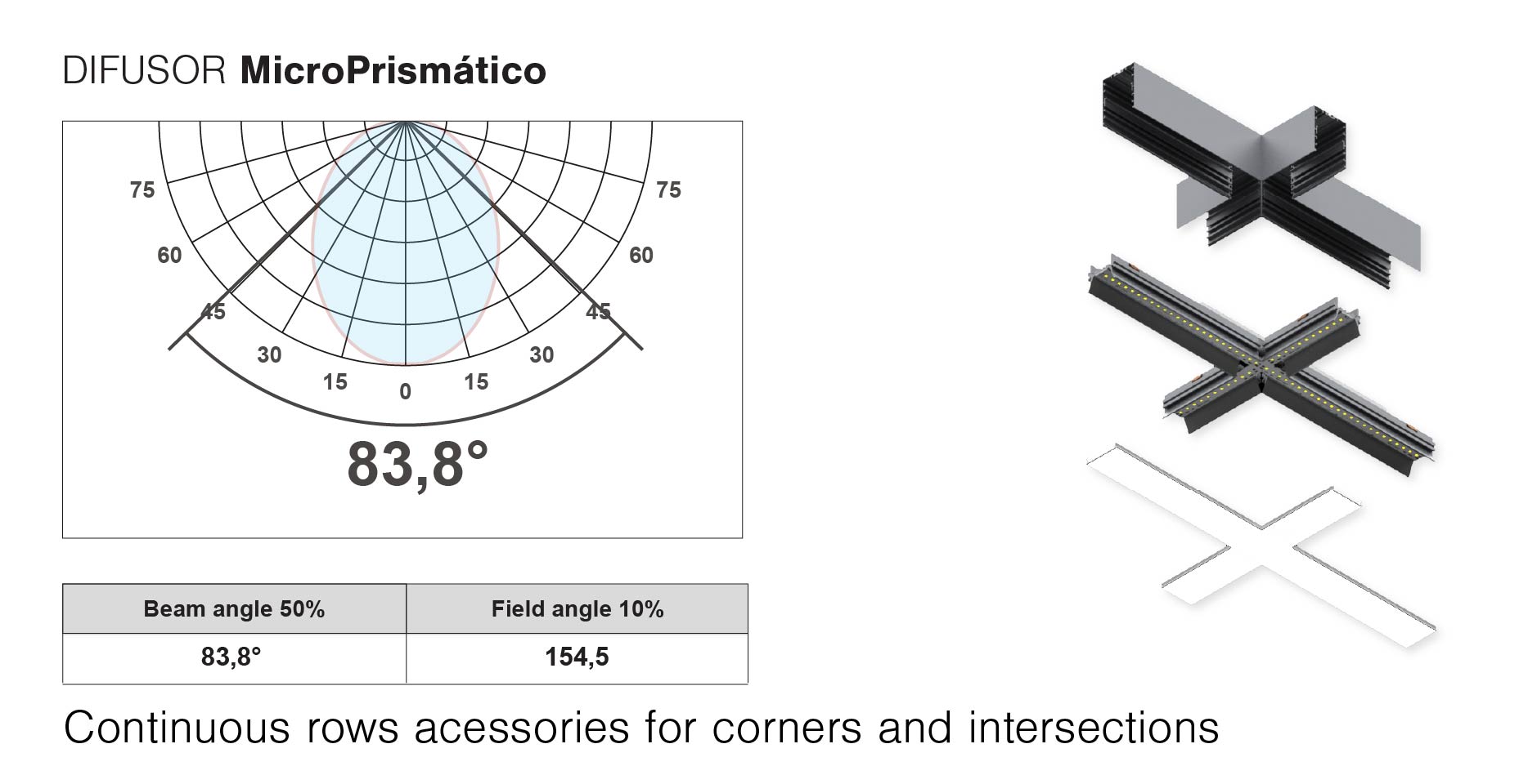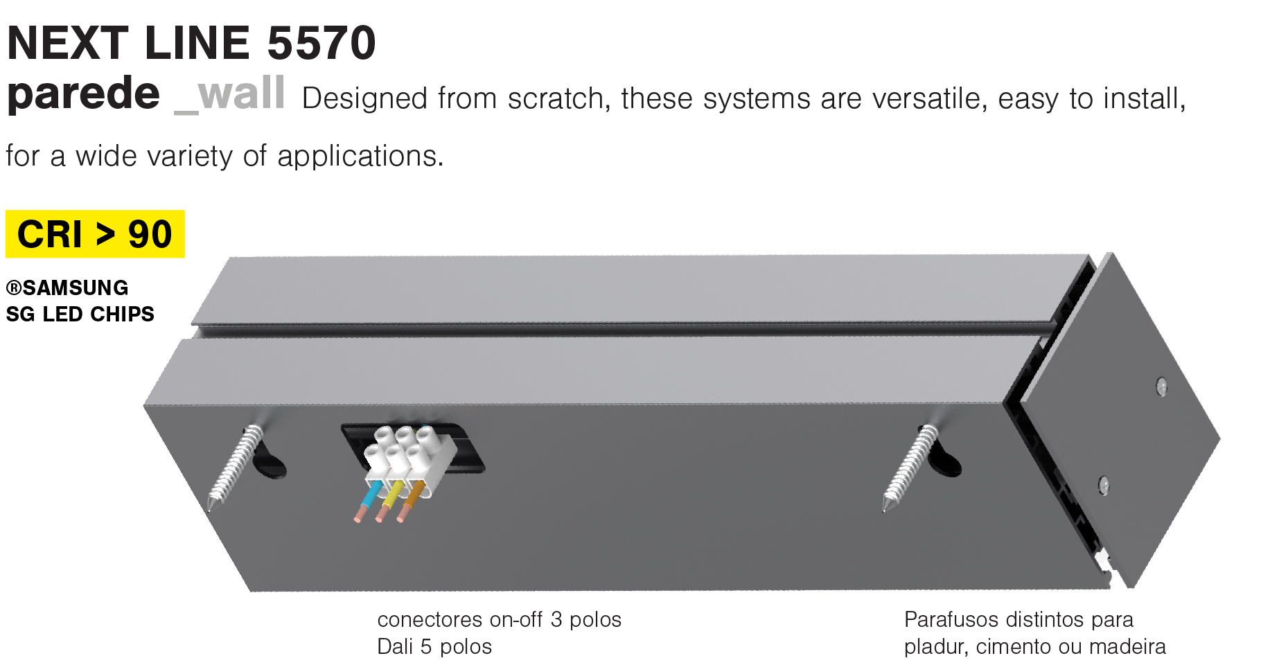 Perfil com 55 x 70mm : sistema all in. Montagem saliente em parede. Sistemas magnéticos ou clip in, facilitam a instalação destes perfis. Luminária contínua com acessórios para cantos e intersecções. Eficiência superior a 160 Lm / watt. Temperatura de cor 2700K, 3000K e 4000K.